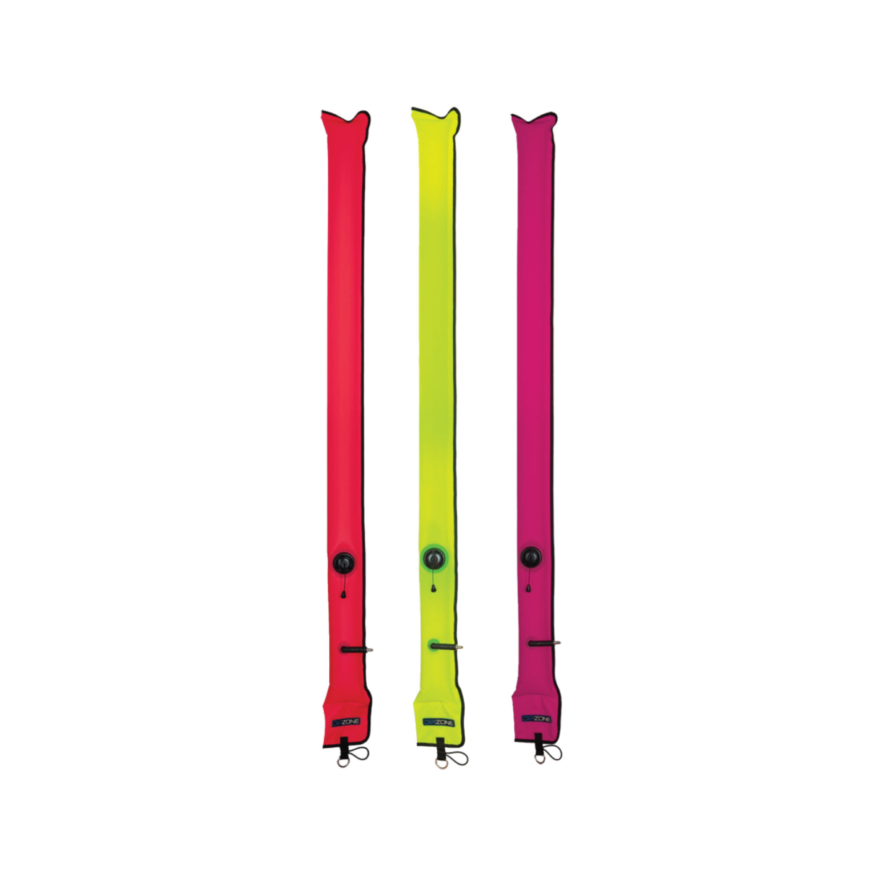 The DIRZone SMB comes in your choice of yellow, shocking pink or orange. These combinations support divers that wish to carry one colour to mark position and one to mark emergencies.