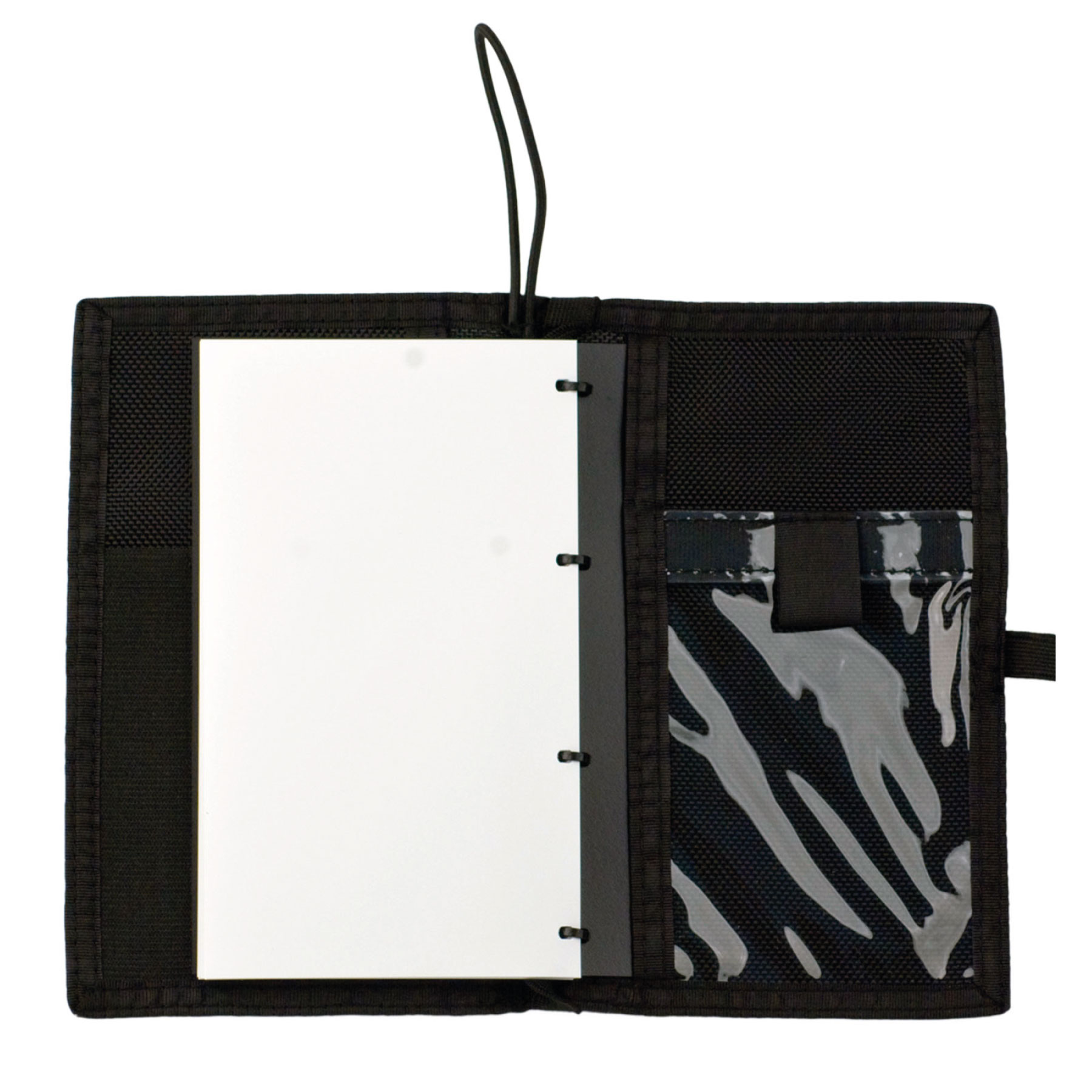 There is one elastic strap that can be used as page marker as well as an additional outer strap that can be used for holding your Halcyon wetnotes closed. There is also a bungee loop stitched on the top hinged center that allows you to clip the wetnotes to your pocket bungies with a double ender.