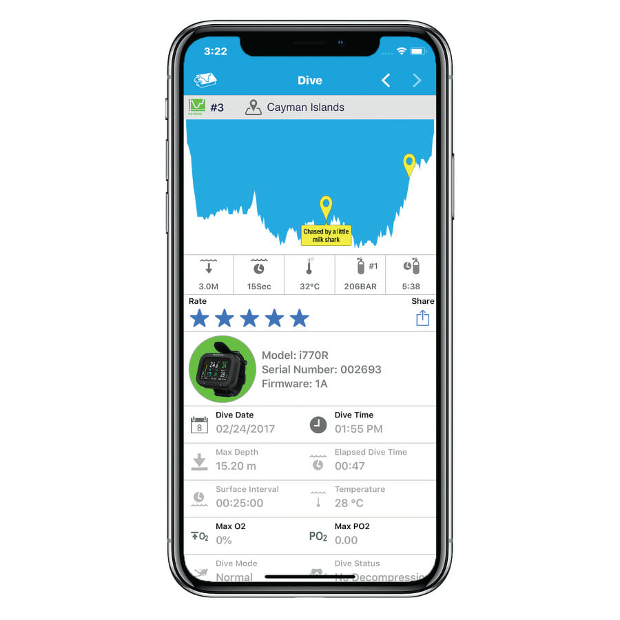 • Remotely control all your i770R settings, view log and profile data, add location, notes and other details, as well as store and share photos and videos of your dive.